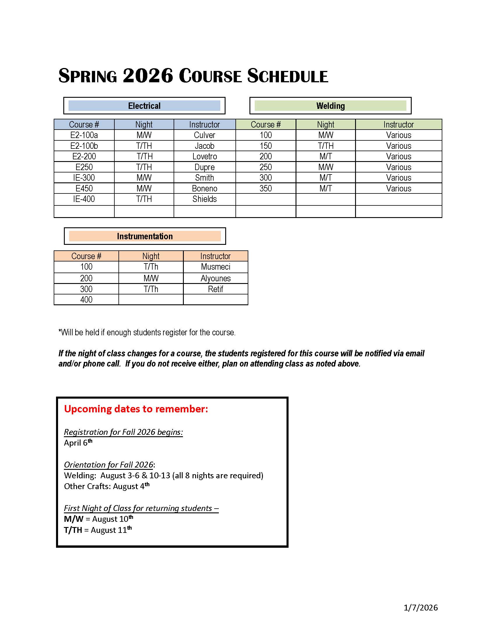 Registration: Registration for Fall 2026 open to all beginning April 6, 2026. Spring 2026 Orientation: (dates subject to change) Orientation (all crafts other than welding) - January 13th Welding Site and Craft Orientation - January 12-15 & 19-22 (Must be present all 8 days of orientation)